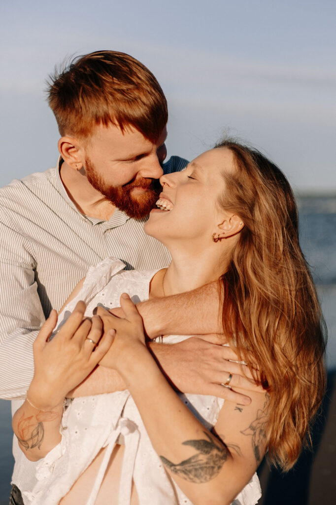 Podczas sesji ciążowej para skupia się przede wszystkim na sobie. Jest dużo przytulania, śmiechu i czułych gestów. Zamiast klasycznego pozowania – swoboda i bycie razem.